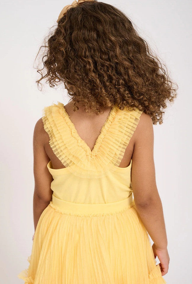 Elegant summer tank top with layers of soft pleated tulle that fits snugly over the shoulders.