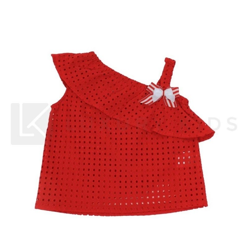 One-shoulder top in solid color San Gallo lace, with ruffles on the front and bow on the side.