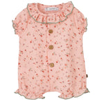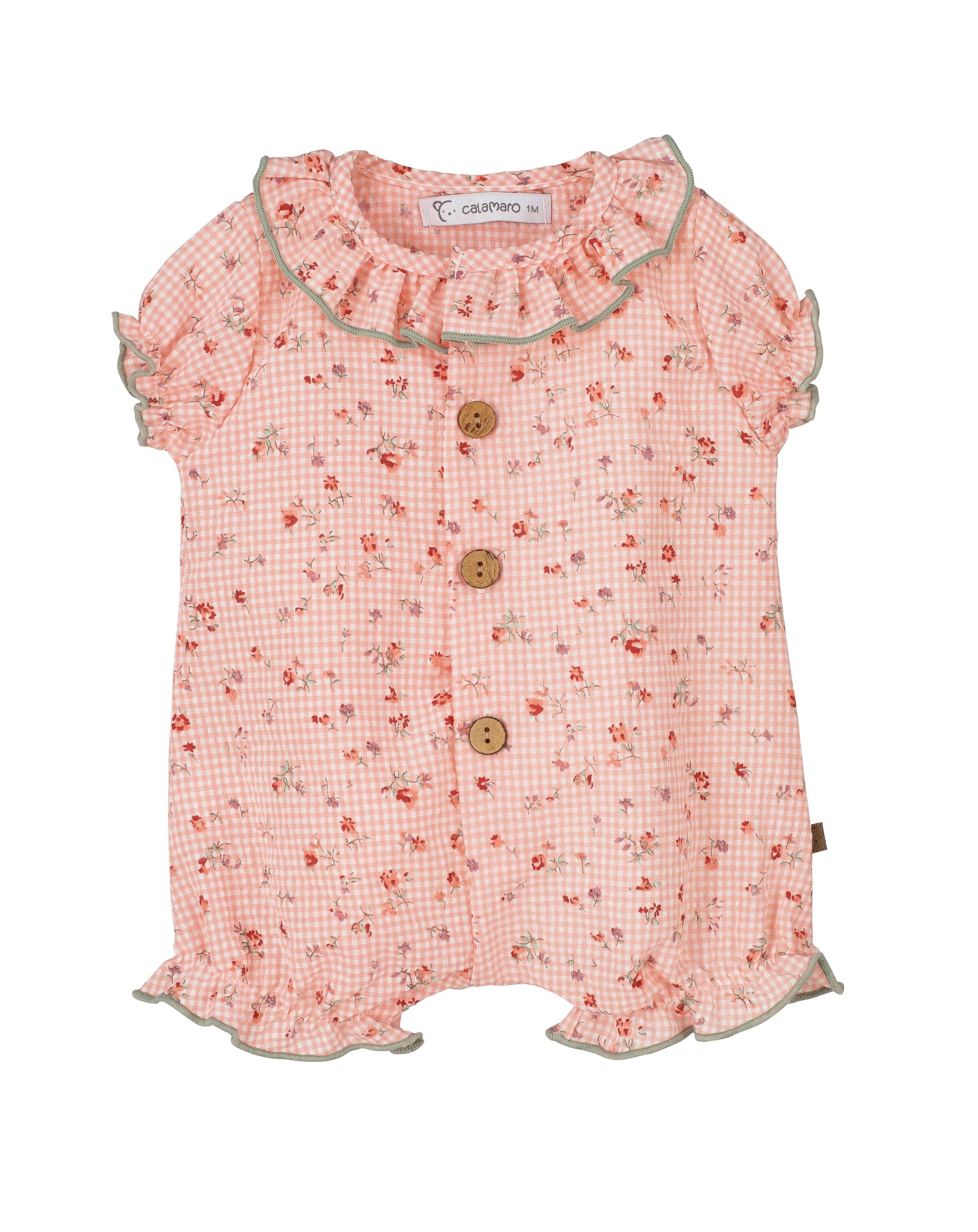 Tuta corta in cotone stampata per neonata, con elegante fantasia e collo con rouches. Bottoni in legno aggiungono un tocco chic. Ideale per un look raffinato e confortevole.