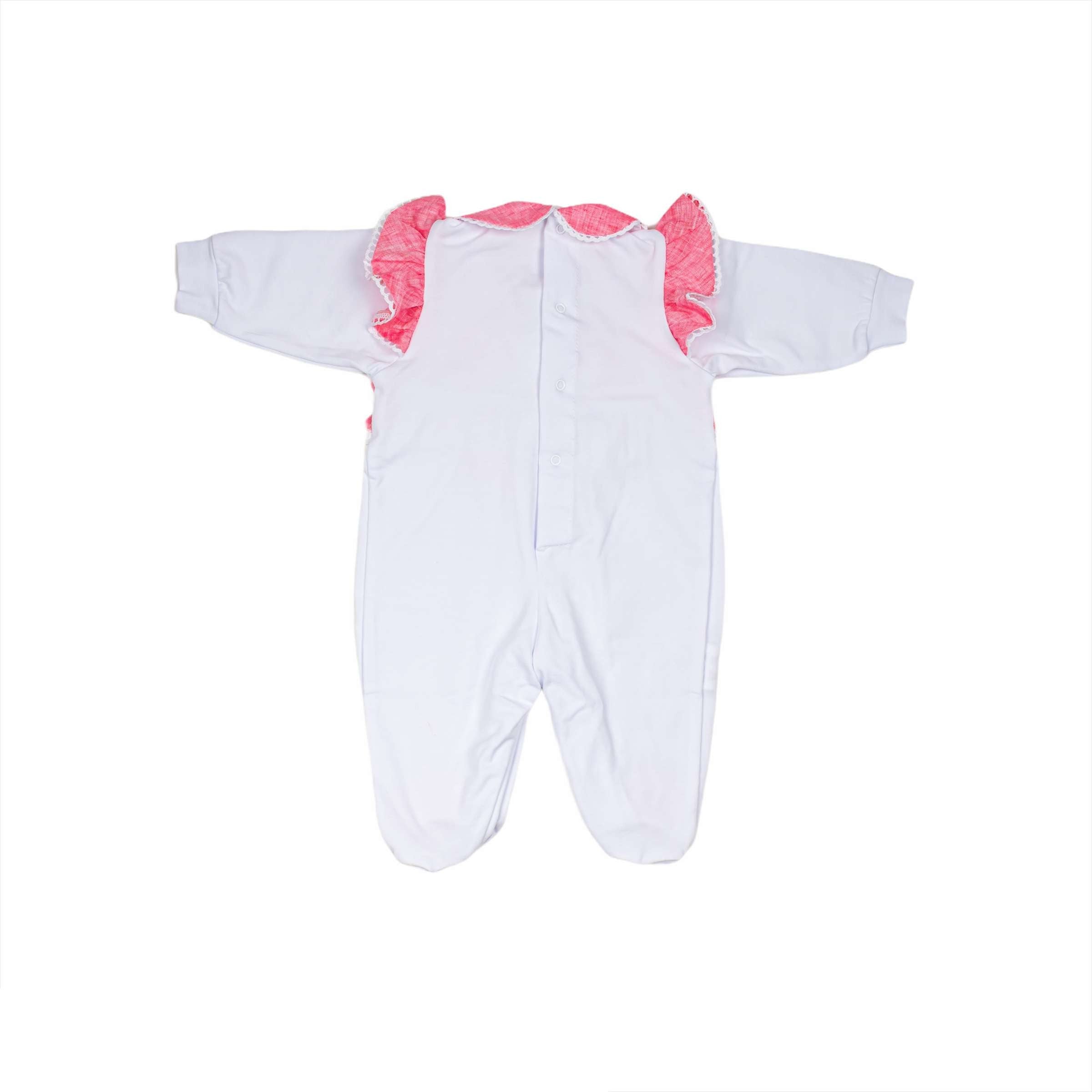 Long Sleeve White Cotton Romper With Pink Linen Rouches On The Sleeve And Waist With San Gallo Lace Flounce, Hints Of The Same Fabric Also On The Bow And Flowers. Collar And Feet In Pink Linen.
