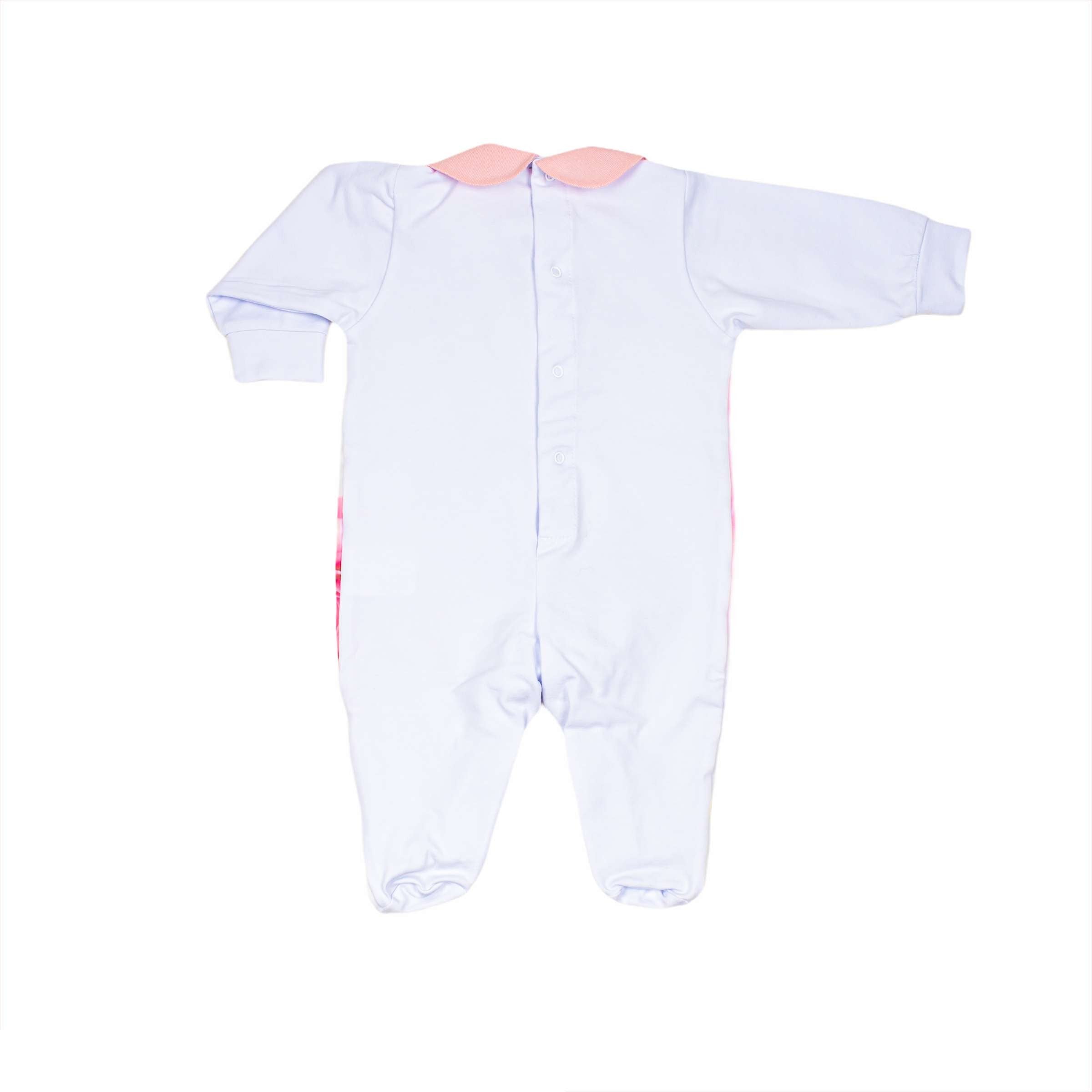 White Cotton Romper, Waist Band Embellished With Bow And Pink Lurex Collar. In the lower part doubled with organza with prints of leaves and roses.