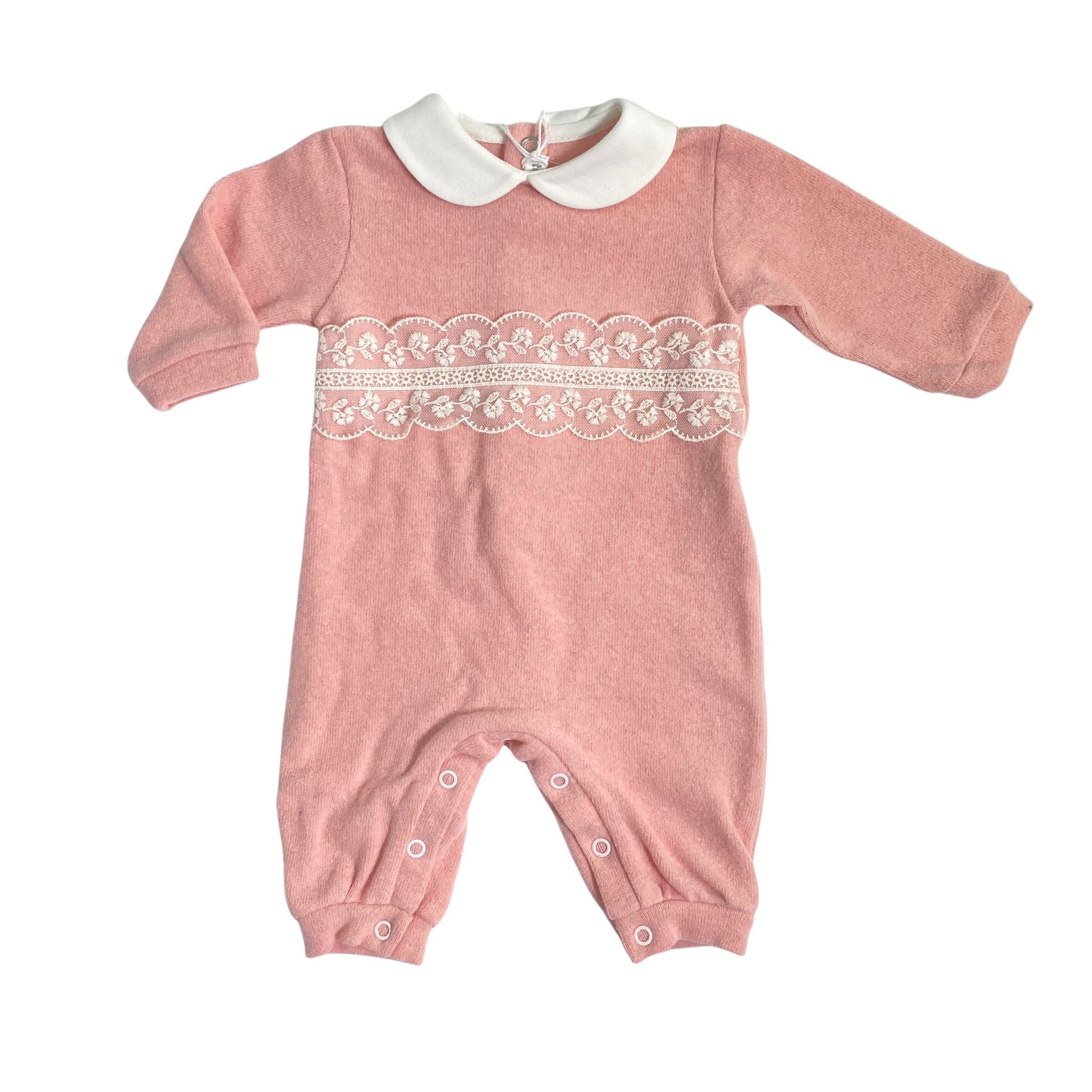 Long-sleeved wool jumpsuit without feet with lace band on the front, closure and opening at the crotch and on the back with press buttons.