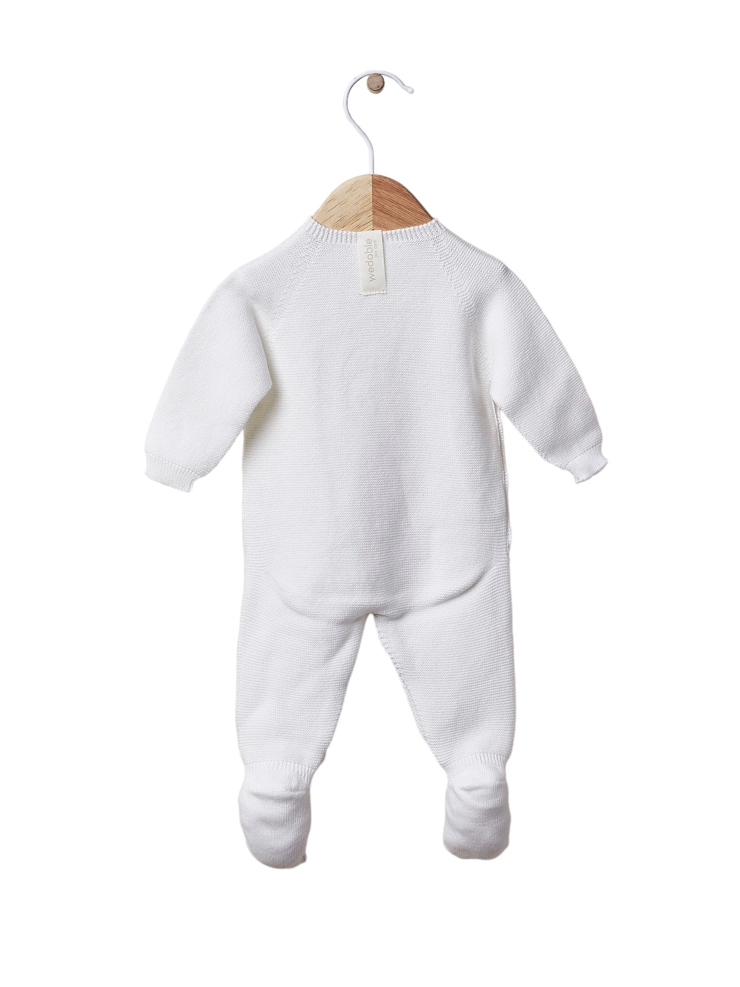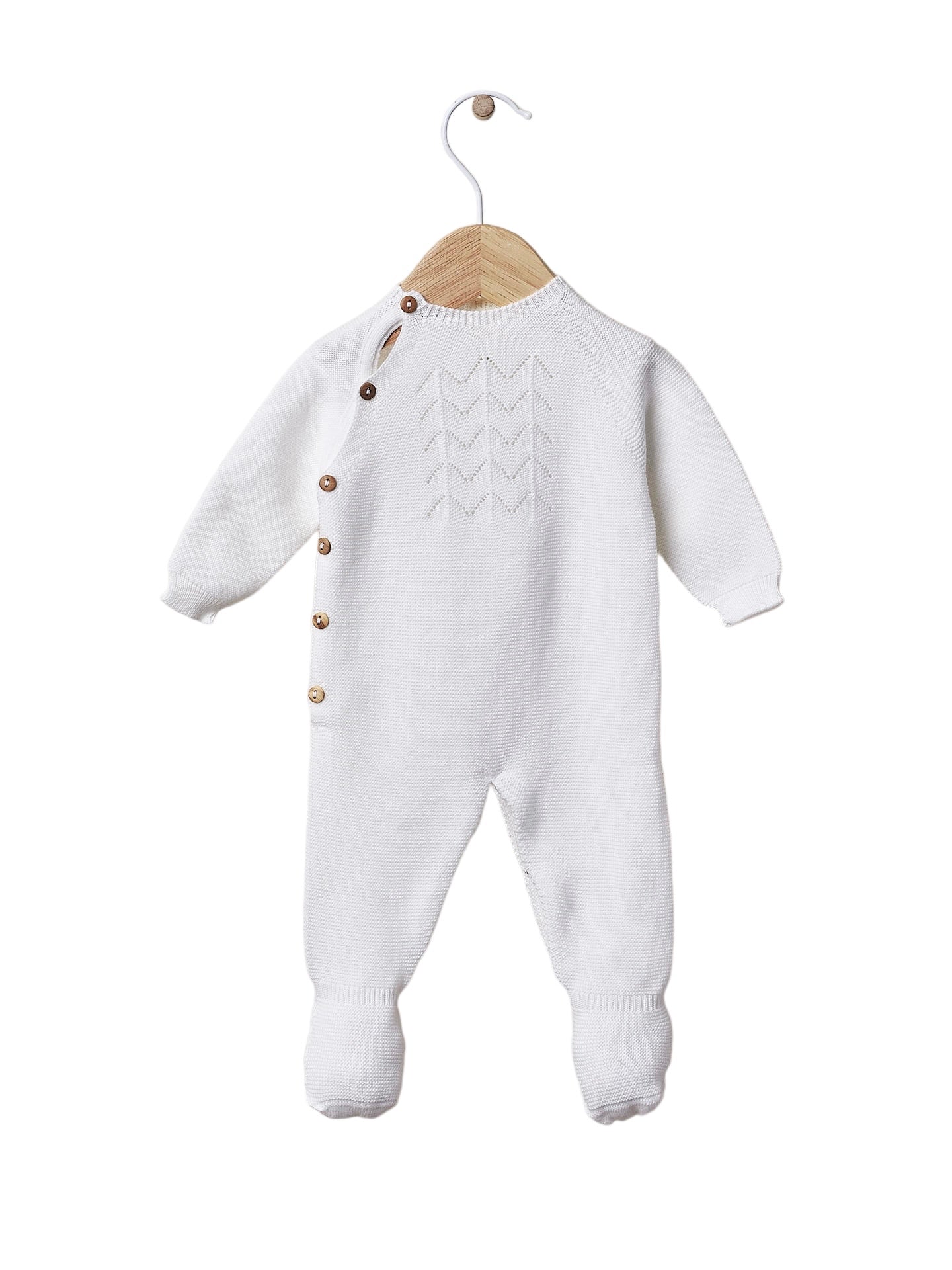 Tutina intera in caldo cotone organico, in tinta unita panna, con traforature.