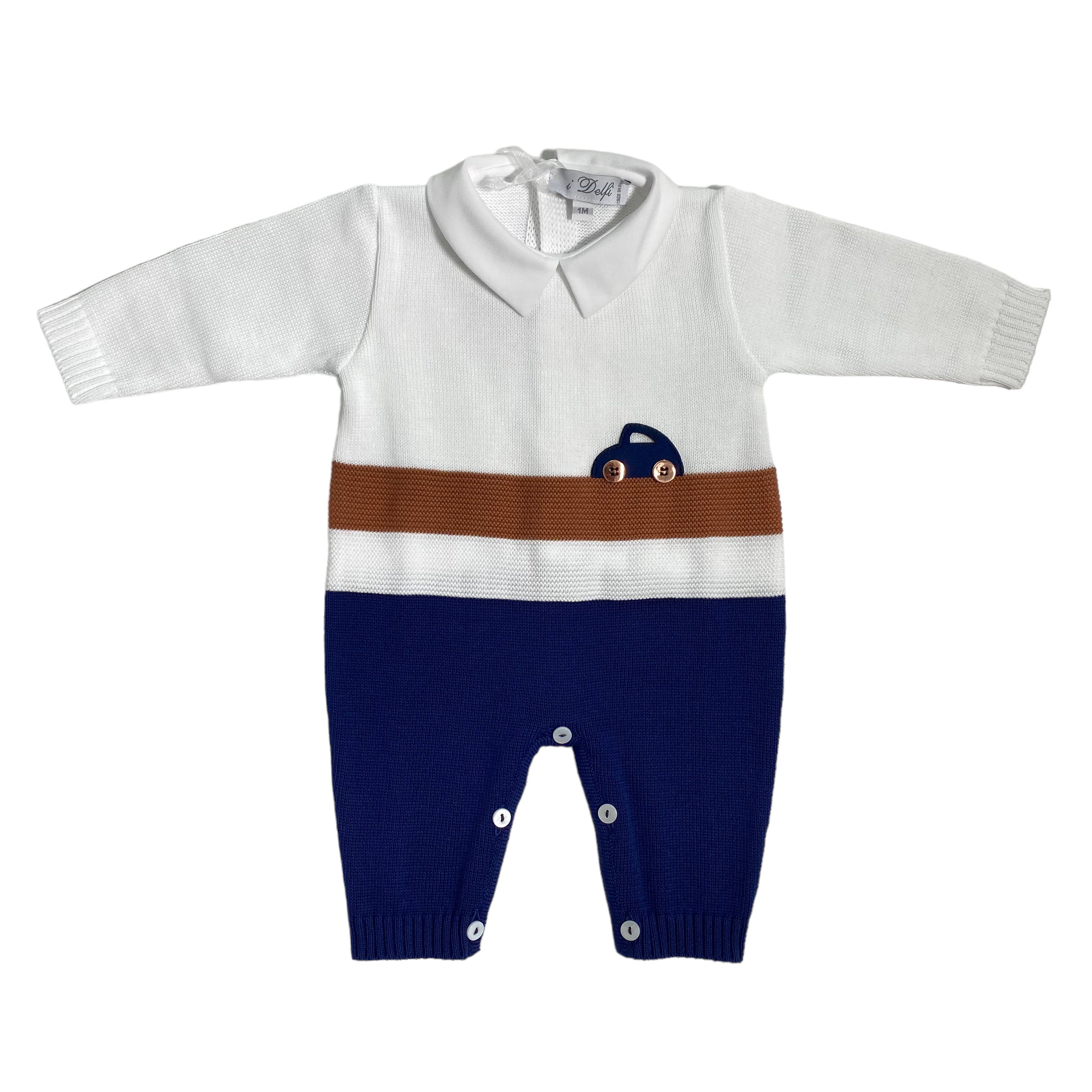 Tutina intera in filo di cotone, con parte superiore bianca, con applicazione di macchinina, e parte inferiore blu.