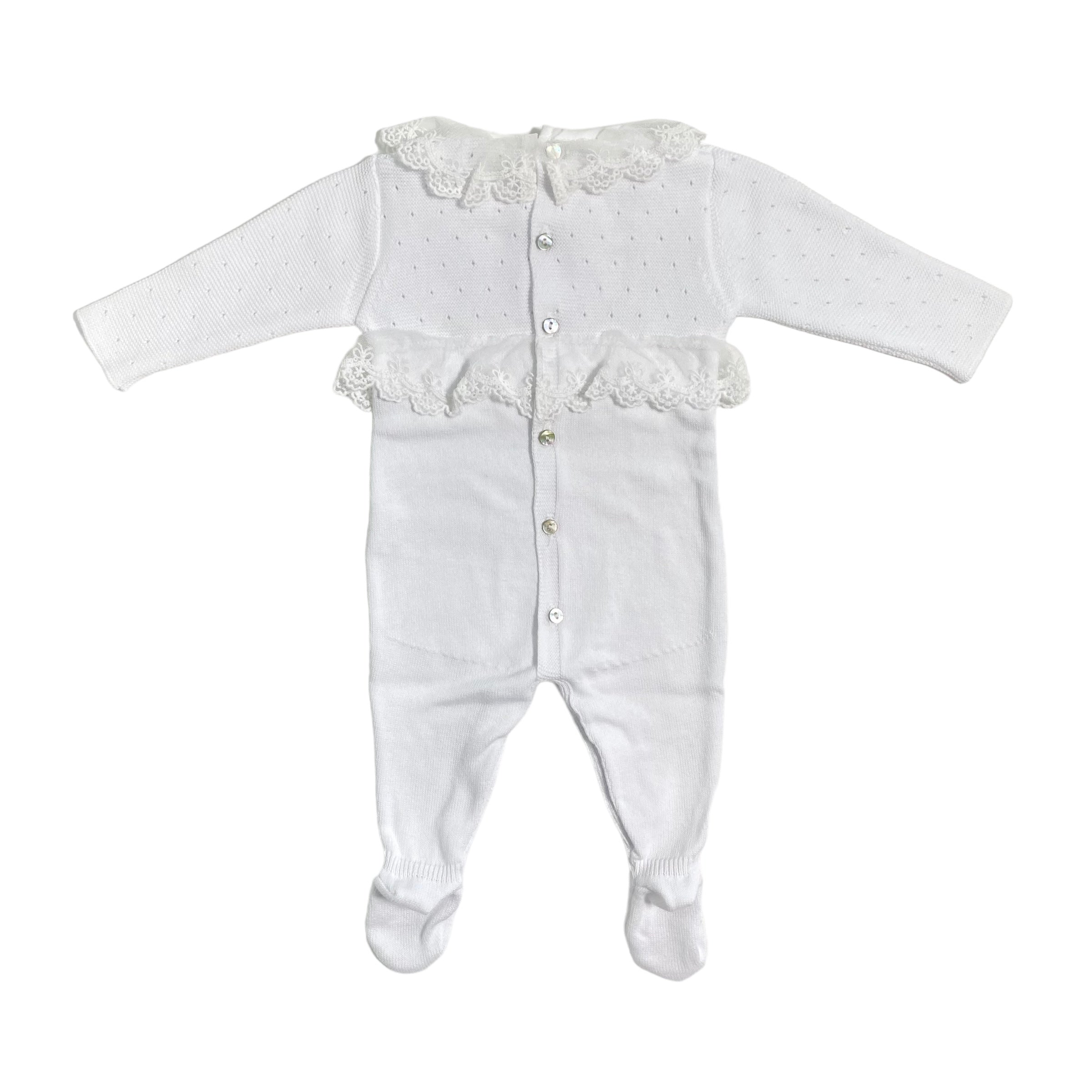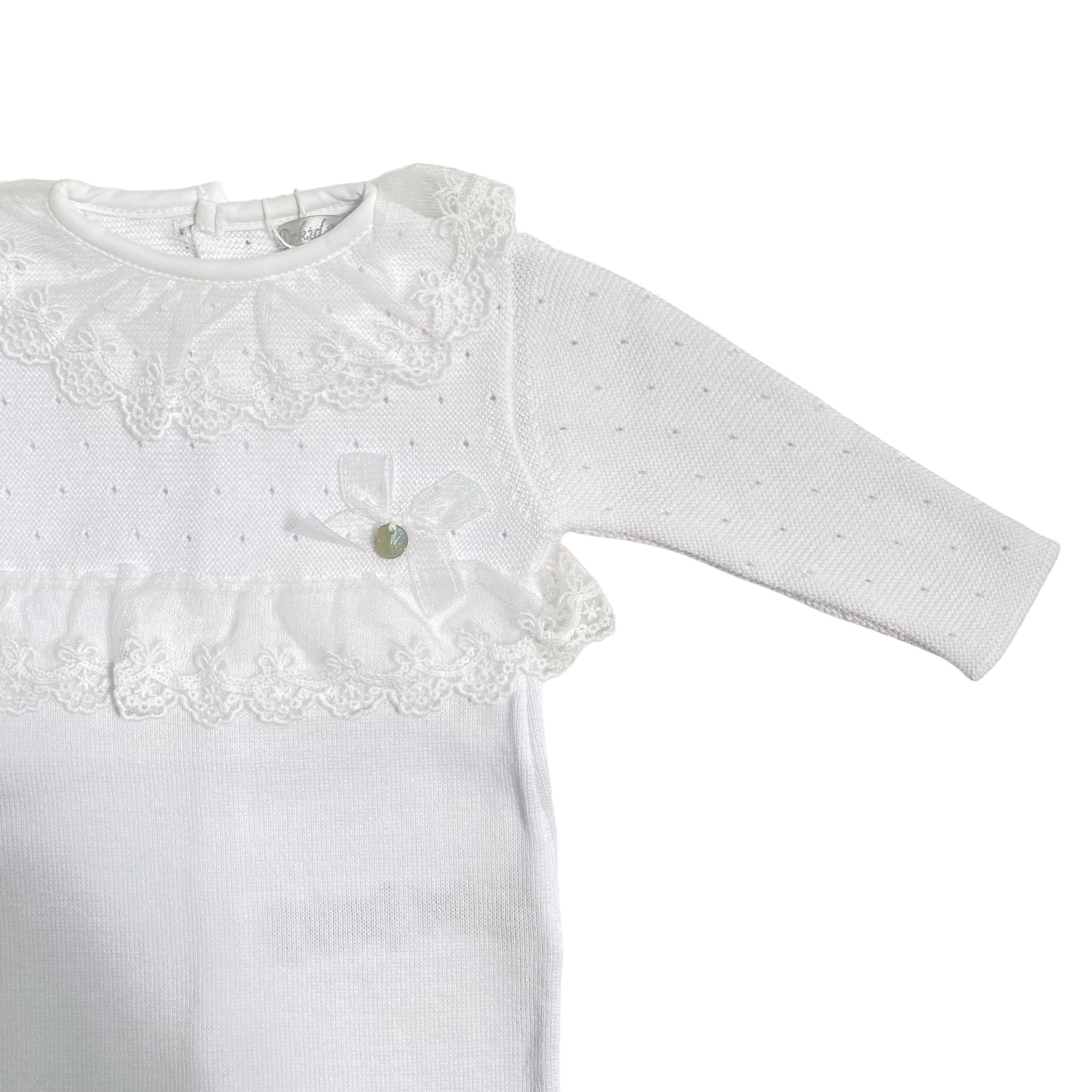 Questa tutina intera in filo di cotone è perfetta per la tua neonata. Il collo in pizzo e la traforatura sul petto la rendono elegante, mentre il fiocco in organza aggiunge un tocco di grazia. Ideale per l'uscita clinica, è realizzata con materiali di alta qualità per un comfort impeccabile.