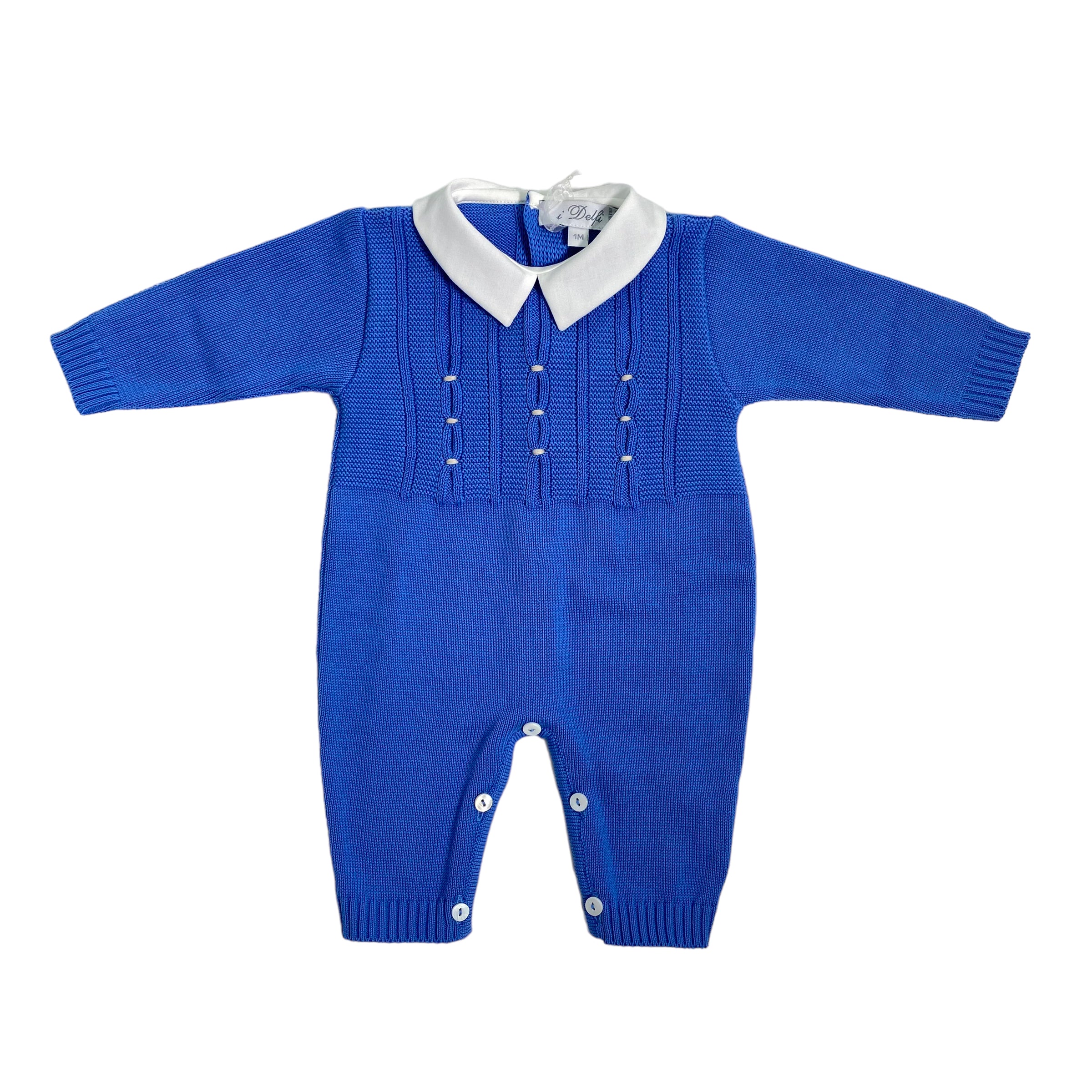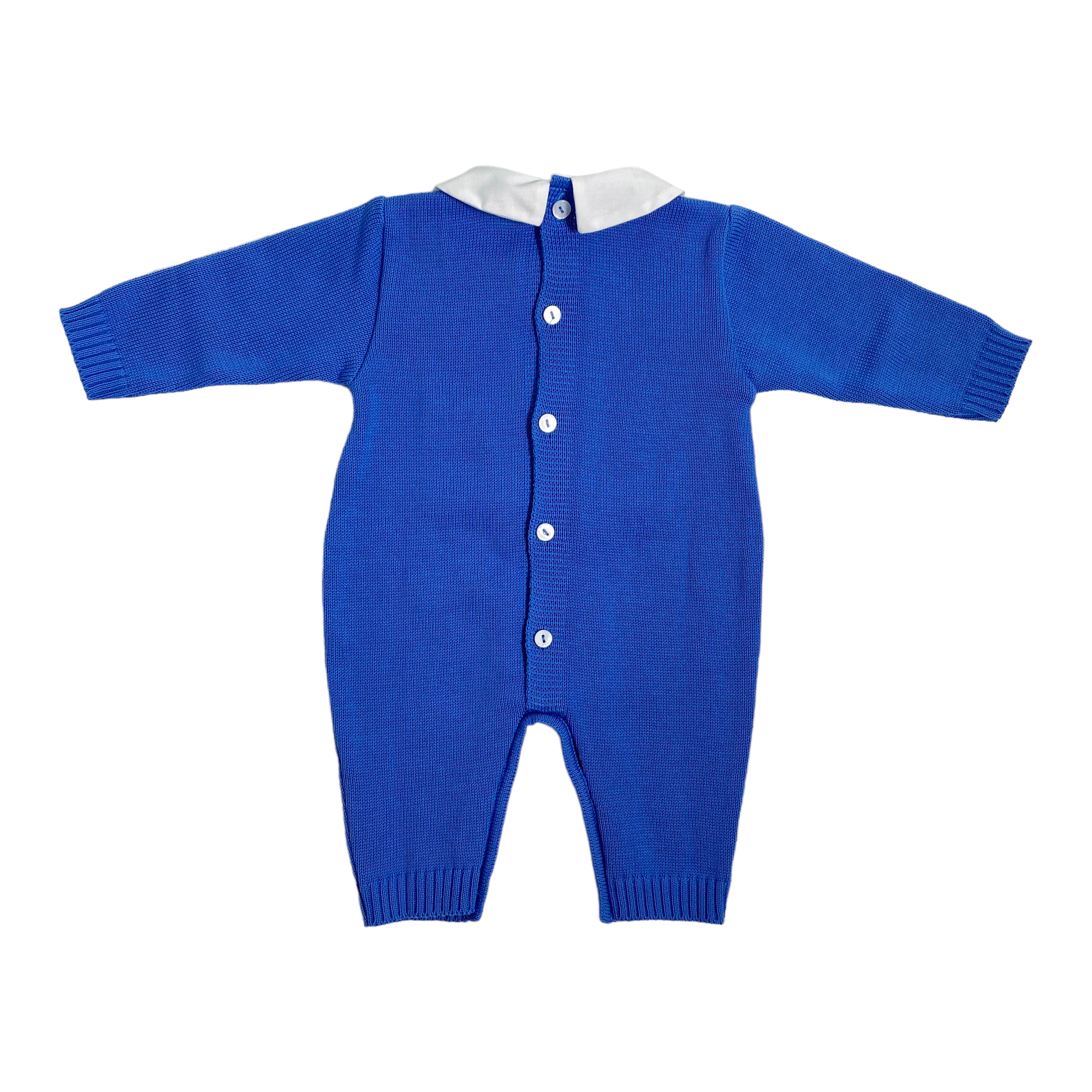 Tutina intera in filo di cotone, in tinta unita bluette, con lavorazione di trecce sul corpetto, e colletto in cotone bianco.