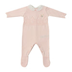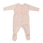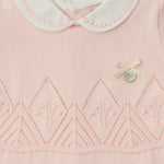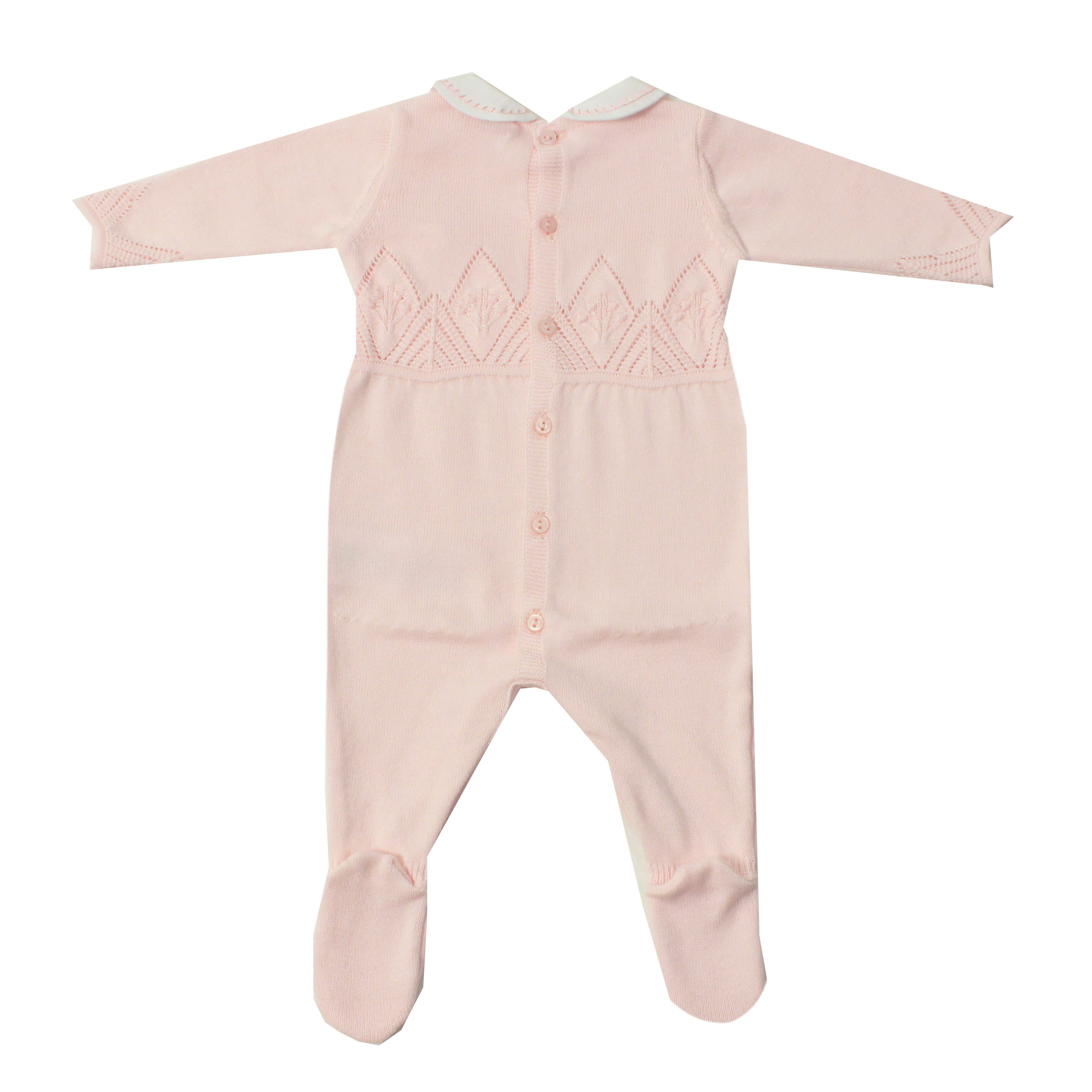 Questa tutina intera è realizzata in morbido filo di cotone e presenta una deliziosa lavorazione traforata. Ideale per l'uscita dalla clinica, grazie al suo collo ricamato, garantirà comfort e protezione alla tua neonata.