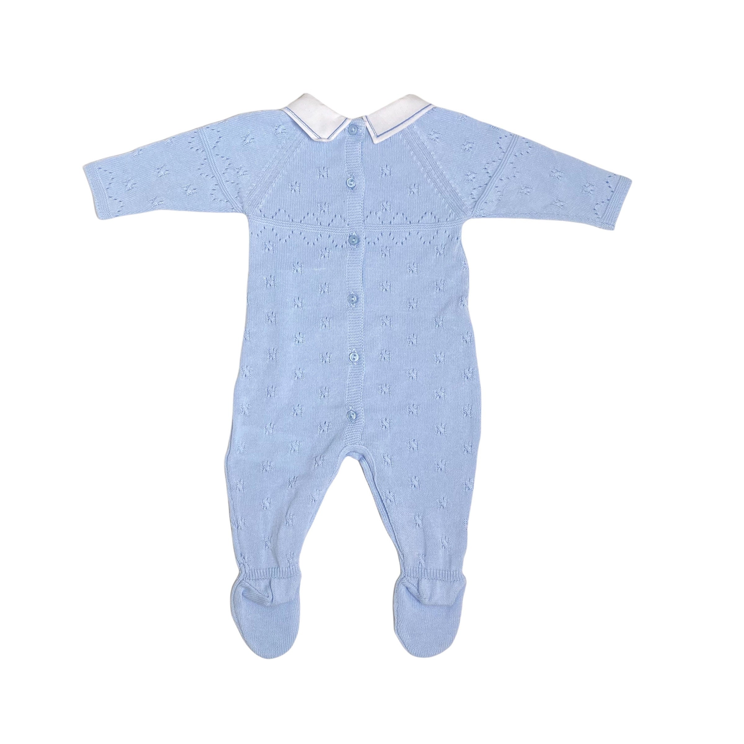 One-piece suit in pierced cotton thread, in solid light blue color, with white cotton collar.