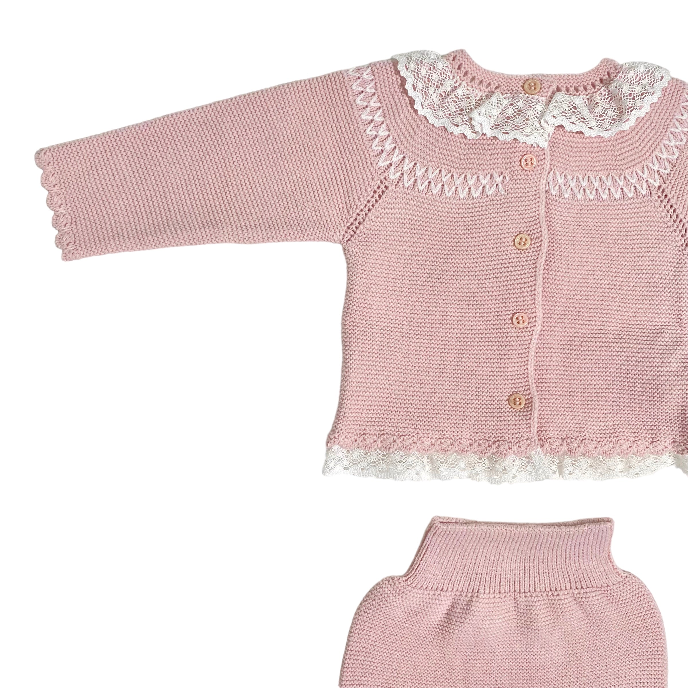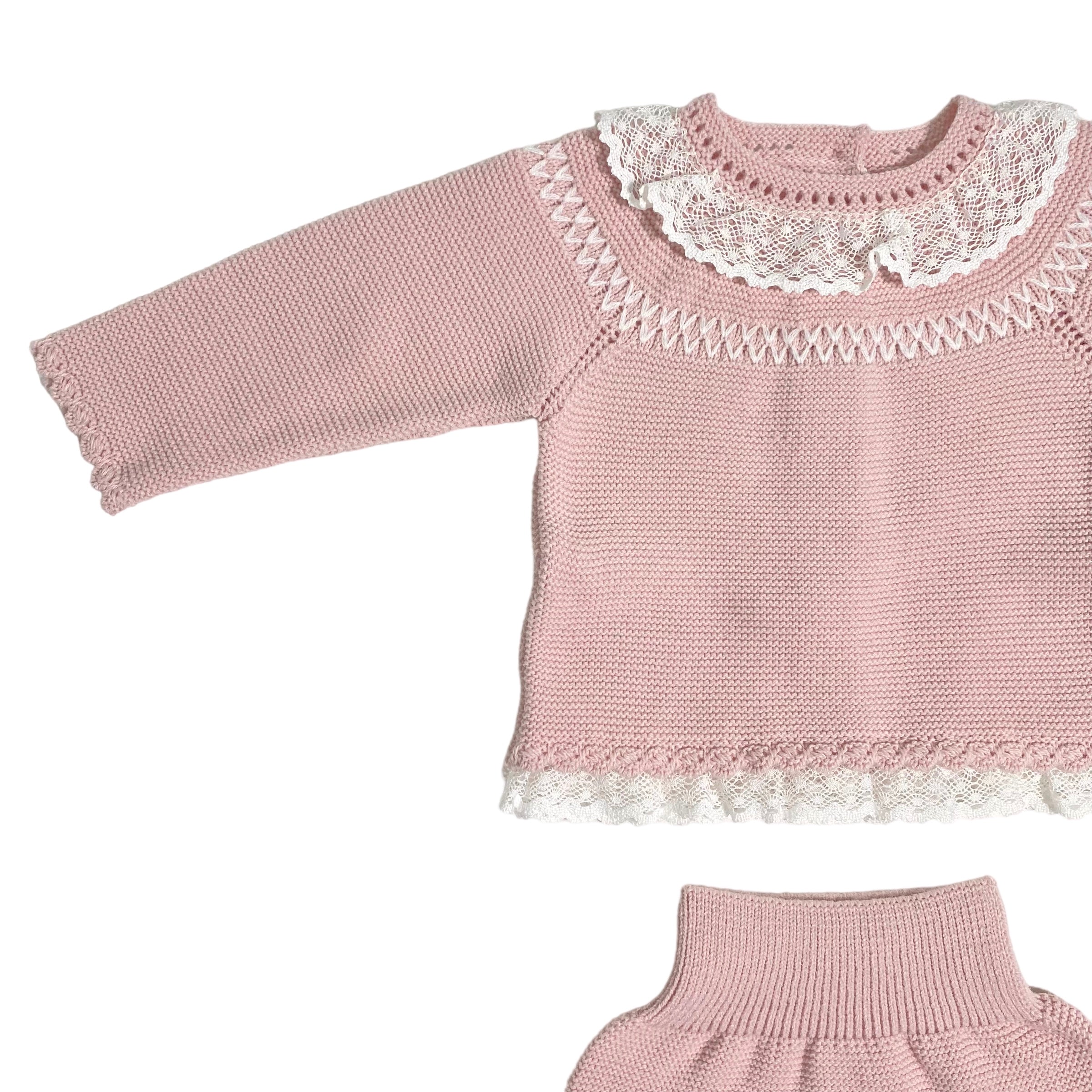 maglioncino con lavorazioni sulla parte alta ,girocollo e bordo della maglia rifinito da pizzo apertura sul retro con bottoni