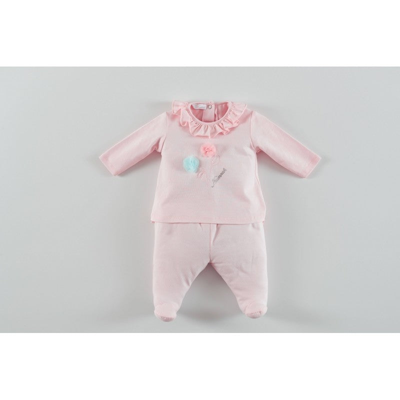 Pink broken cotton onesie, with rouches on the gaiter and applications on the shirt.