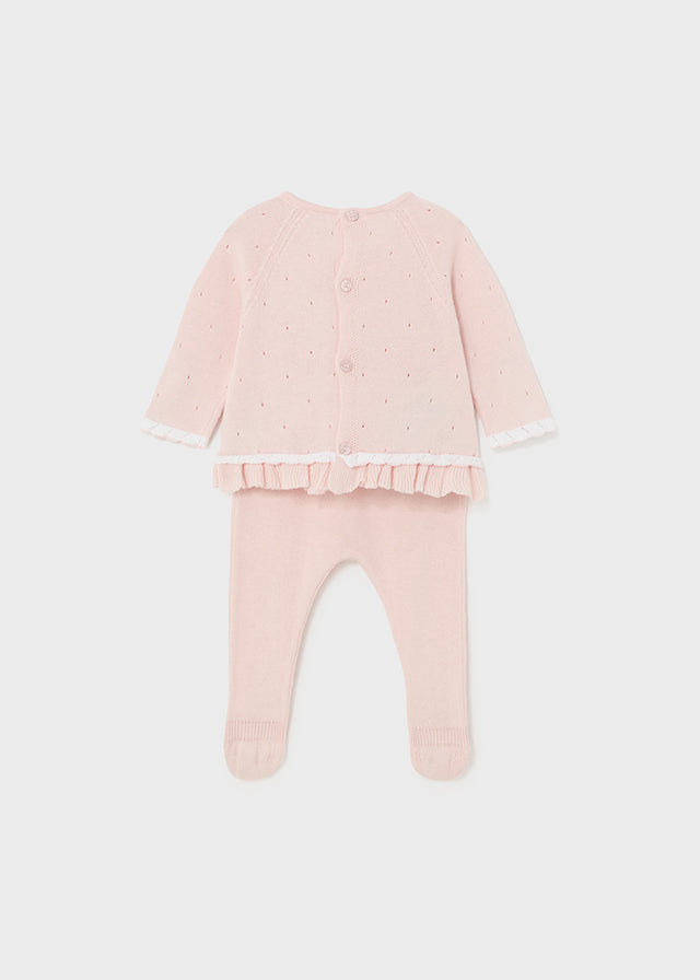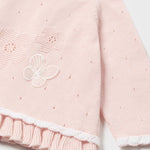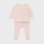 Vestito manica lunga per neonato. Girocollo. Chiusura con bottoni sulla schiena per facilitare la vestibilità del capo. Tessuto a maglia morbido e piacevole al tatto. Design con volant decorativo nella parte bassa.