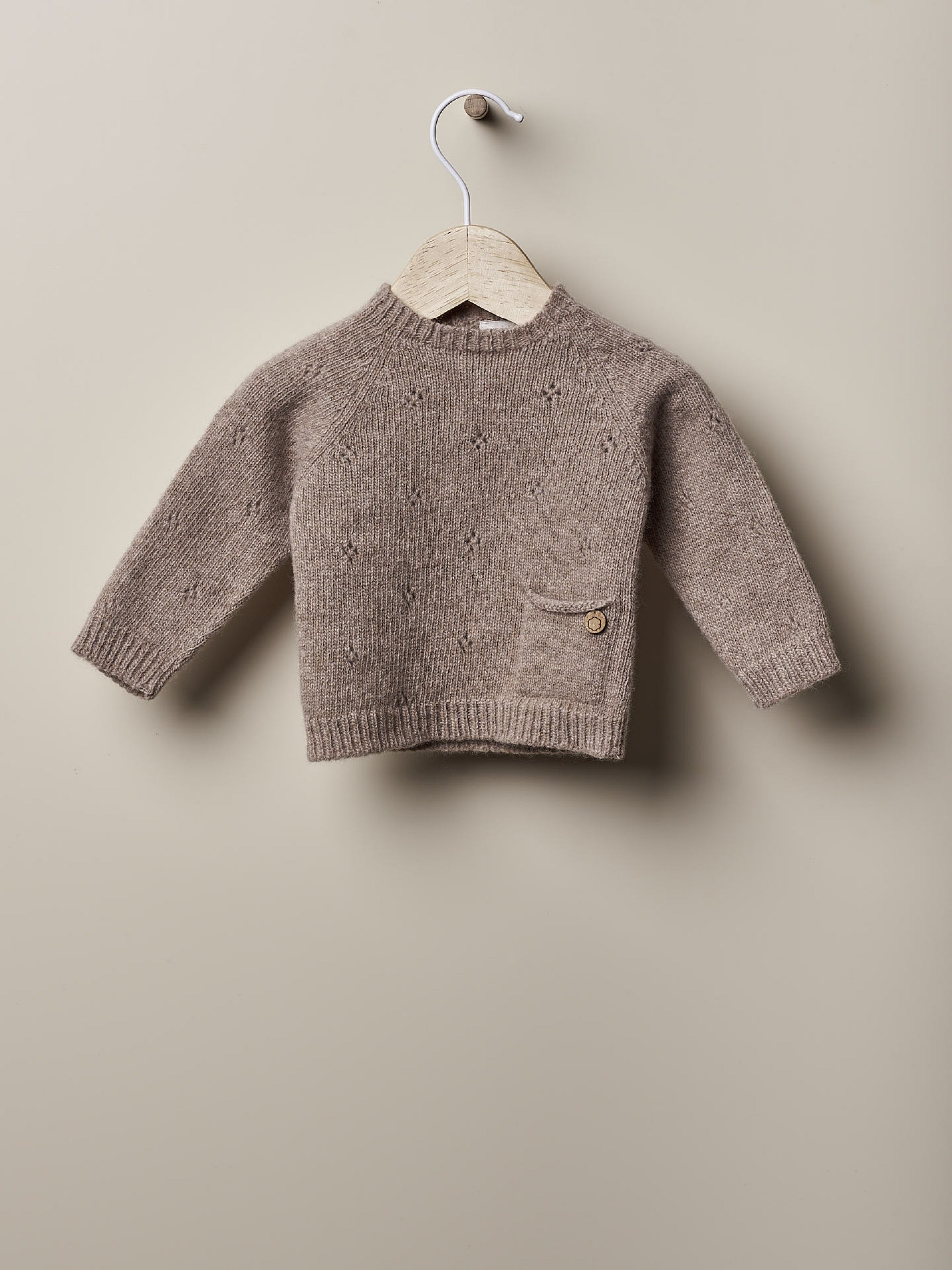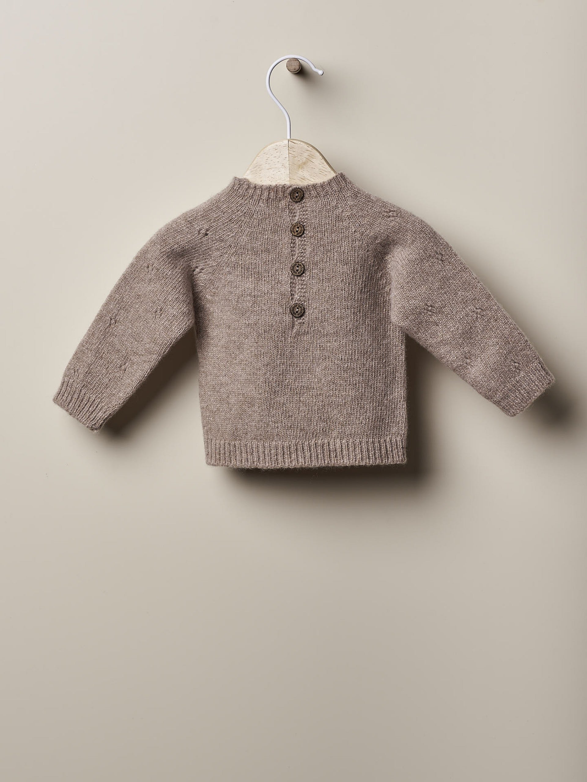 Maglione lavorato a maglia e ghettina in morbida lana merino extra fine, ottimo per neonati. TONI DI GIARDINI IN INVERNO Il maglione a maniche lunghe è lavorato a punto ajour, con una dolce tasca sul davanti. Si chiude dietro con bottoni in cocco. Realizzato con la tecnologia Wholegarment, questo capo è privo di cuciture per il massimo comfort del tuo bambino.