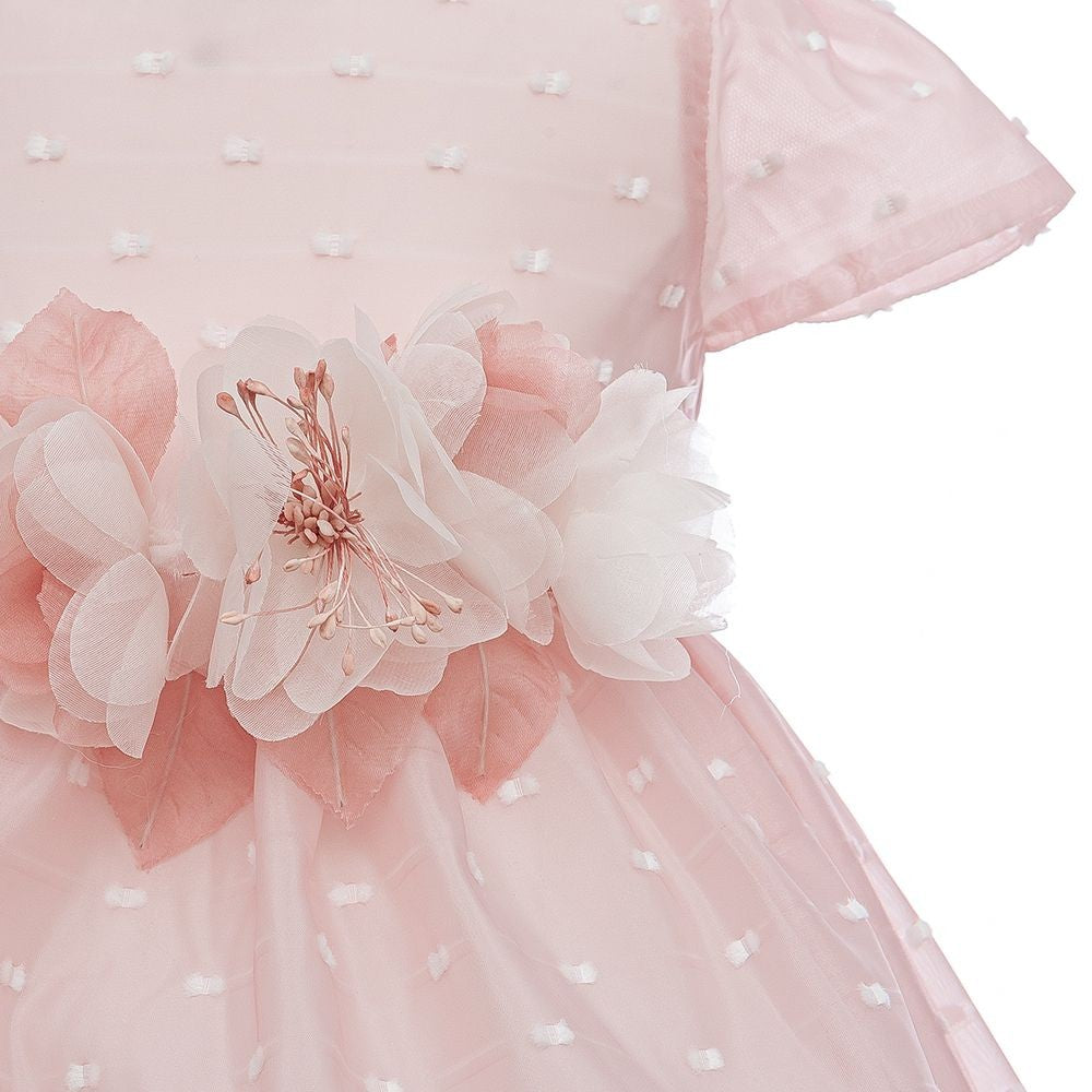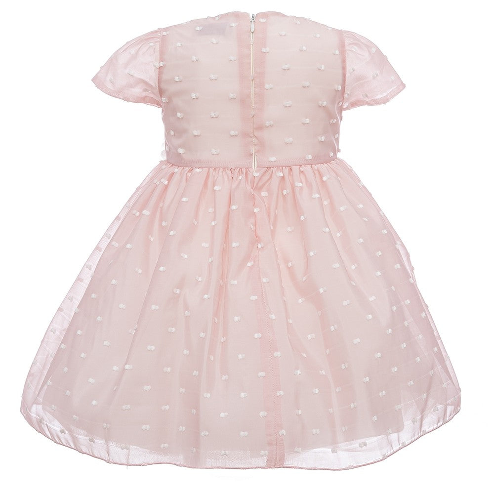 Baptismal Dress In Pink Plumetis. Short sleeves. Internally lined with cotton and rigid tulle to keep the skirt wide.