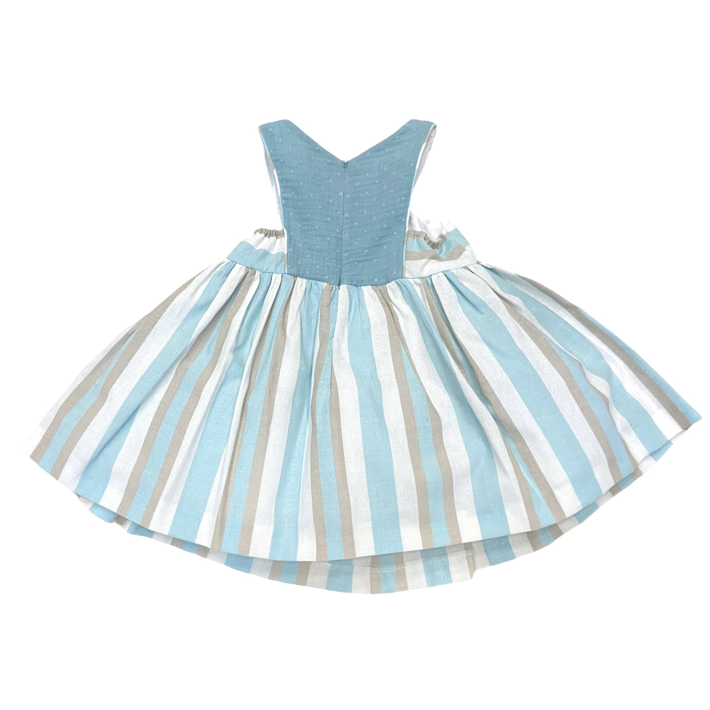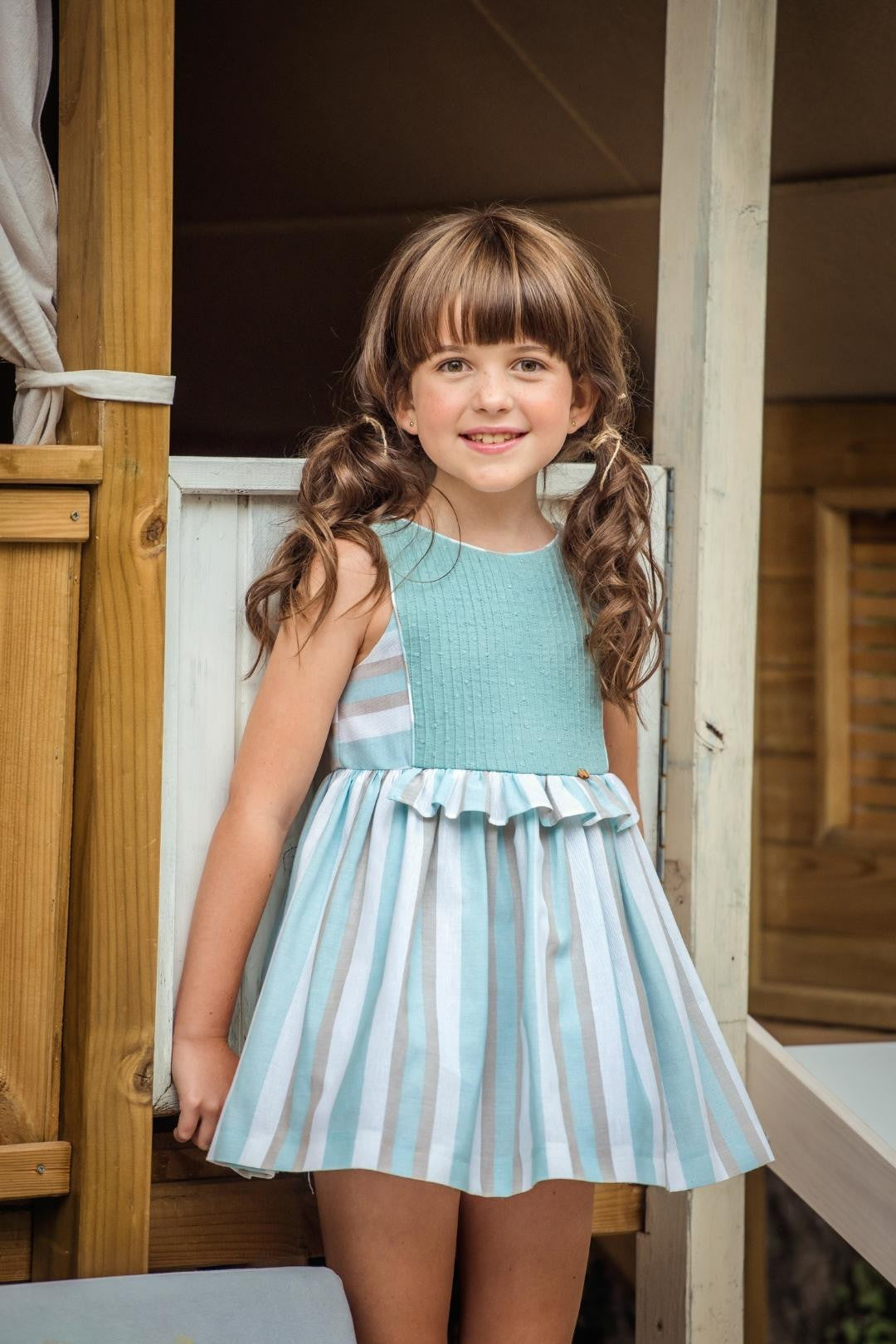 Armhole with powder green bodice. On the waist a very simple flounce that takes up the pattern of the skirt, with green, white and beige stripes.
