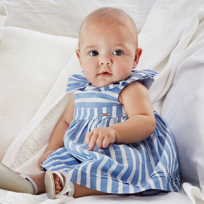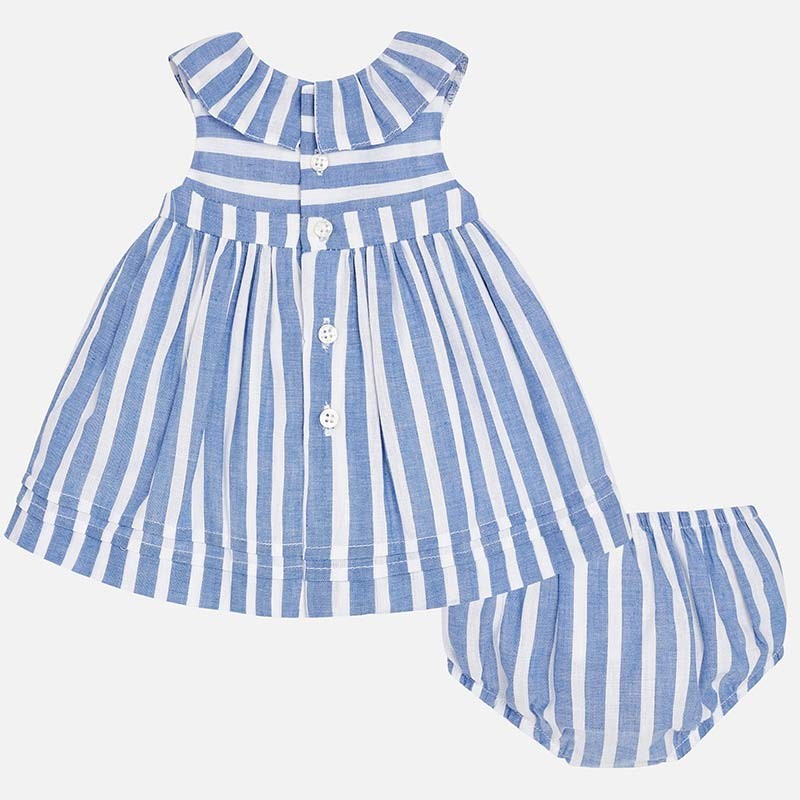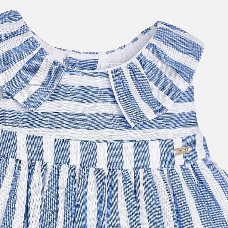Armhole dress. Crewneck. Closure with snap buttons in the back that facilitate the fit of the garment. Model with hedgehog and ruffles. Striped texture.