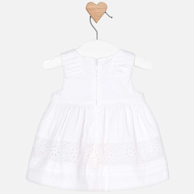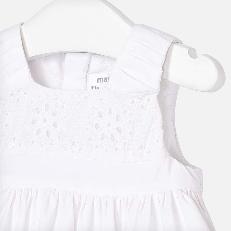 Dress with straps and tone-on-tone details for baby girls. Crewneck. Design with cut at the waist. Back opening with invisible zipper. Comfortable, durable and easy-care poplin fabric. Model with hedgehog. Decorative elements: openwork details.